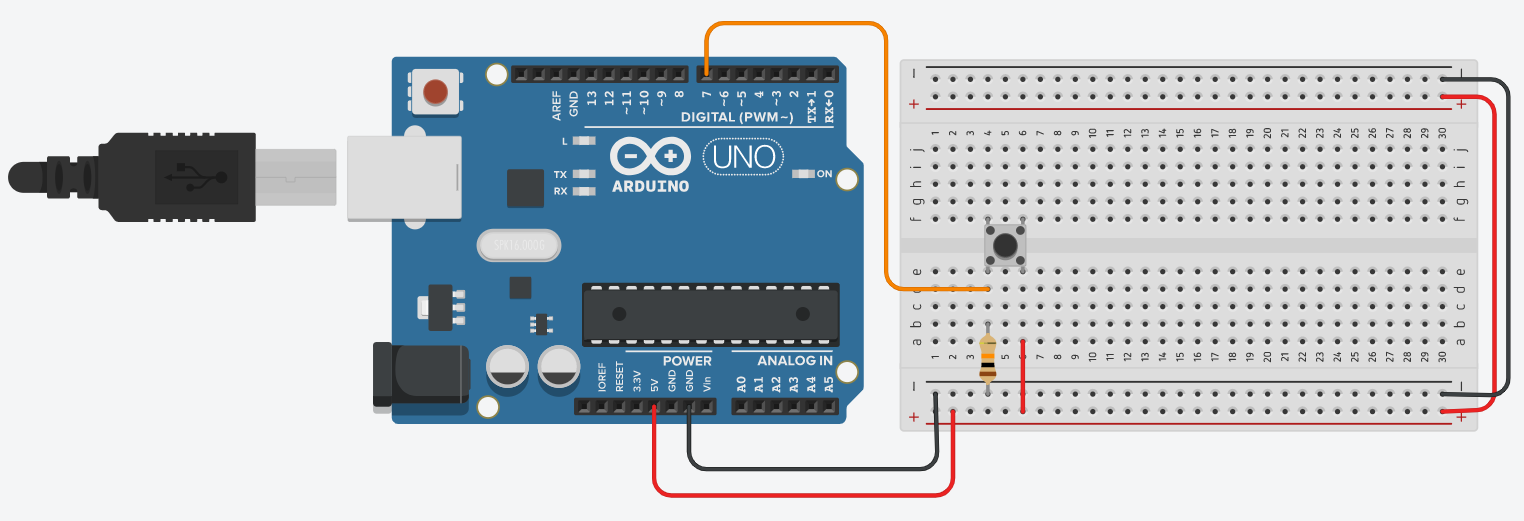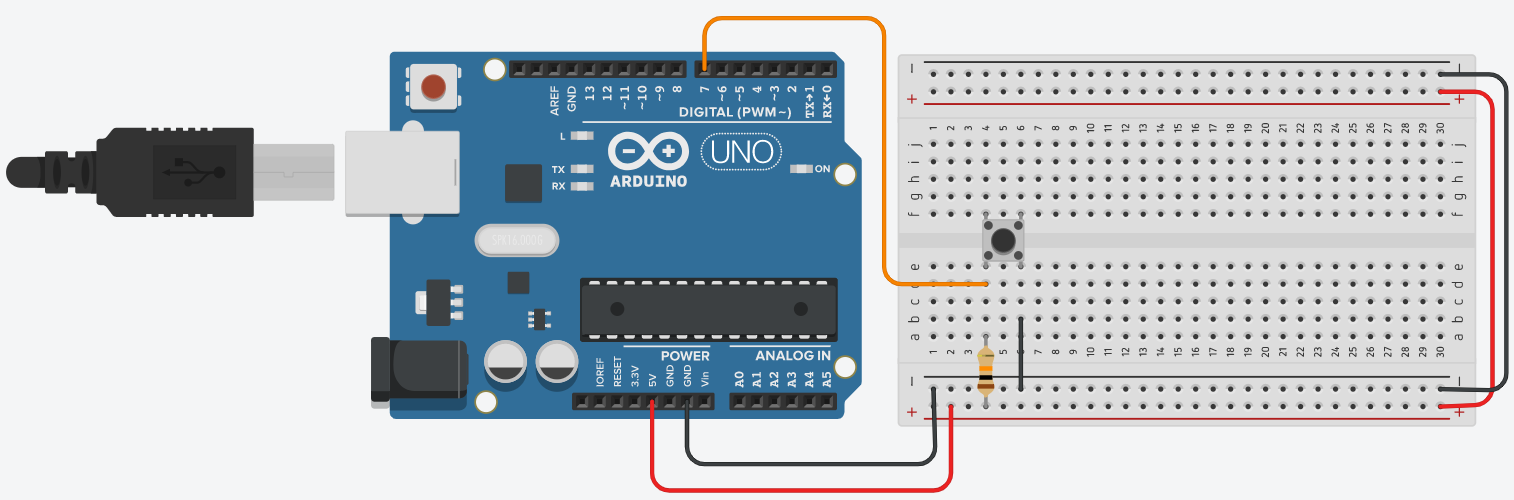 그림과 같이 스위치 제어 핀(D7) 연결된 라인과 전원 라인 사이에 저항을 연결해주는 방법이 풀업 저항 방식입니다. 이 경우 버튼을 누르지 않았을 때 스위치 제어 핀(D7)이 전원(5V) 라인과 연결되어 HIGH(1)의 신호를 출력합니다. 버튼을 눌를 때 스위치 제어 핀(D7)이 GND 라인과 연결되어 LOW(0)의 신호를 출력합니다.