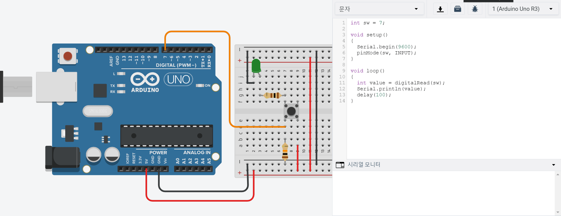 스위치를 누르지 않을때는 스위치 왼쪽 라인에 LOW(0), 오른쪽 라인에 HIGH(1)이 출력됩니다.