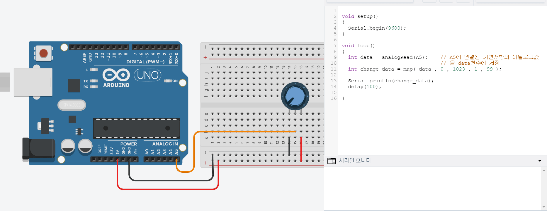 가변저항과 map 함수를 사용해 1~99값의 데이터를 사용할 수 있는 프로그램을 완성했습니다.