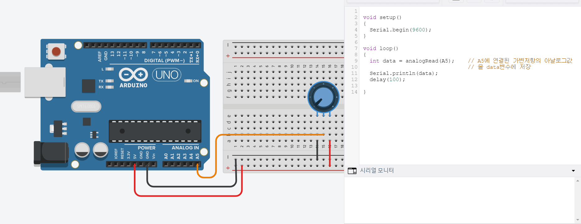 int data = analogRead(A5); // A5에 연결된 가변저항의 아날로그값을 data변수에 저장