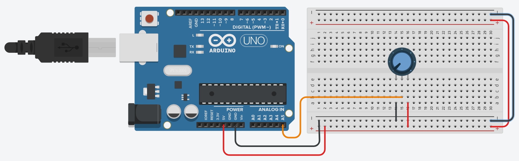 가운데 선을 아날로그핀(A5)으로 연결하고 나머지 두 핀을 전원과 그라운드에 연결하면 됩니다.
