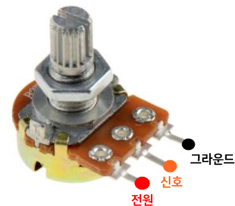 실제 가변저항은 저런 모양의 것을 많이 사용합니다. 띵커캐드로 작성한 회로도와 같이 가운데 선이 아날로그 신호선, 나머지 선을 전원과 그라운드에 각각 연결하면 됩니다.