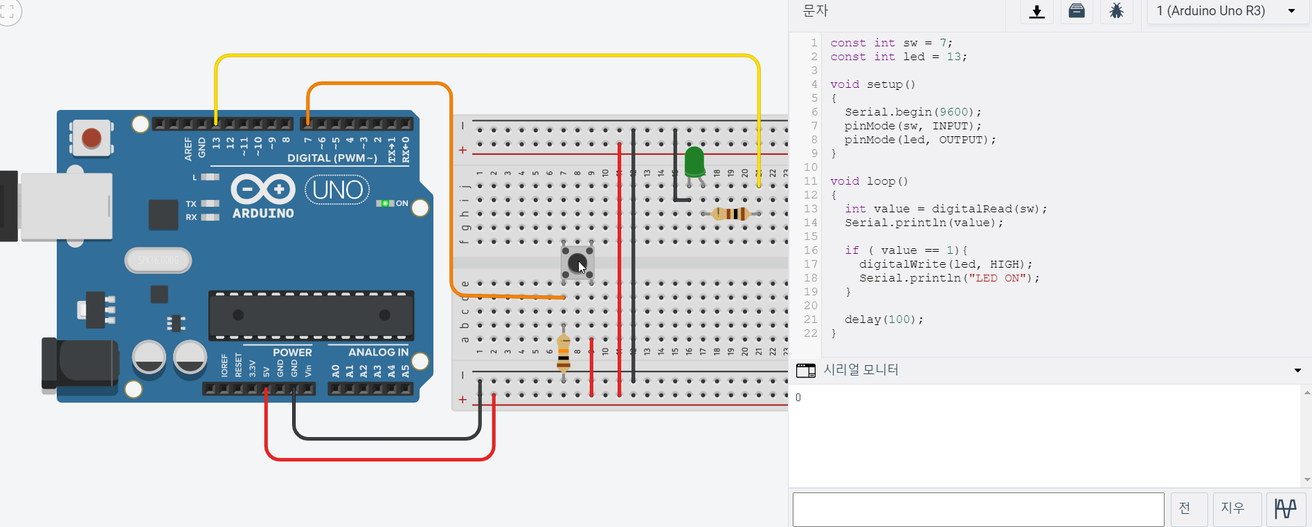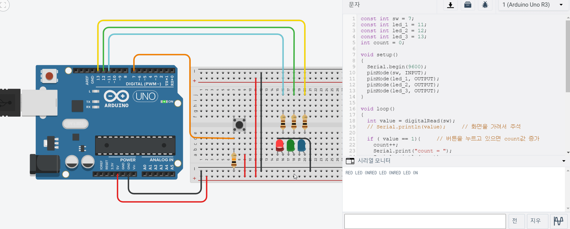 평상시엔 value값이0이고 스위치를 눌렸을 때 value값이 1이 되는 회로를 만들었습니다. 그리고 if문을 통해value값이 1이 되었을 때 count 변수의 값을 1 증가시킵니다( count++ ).