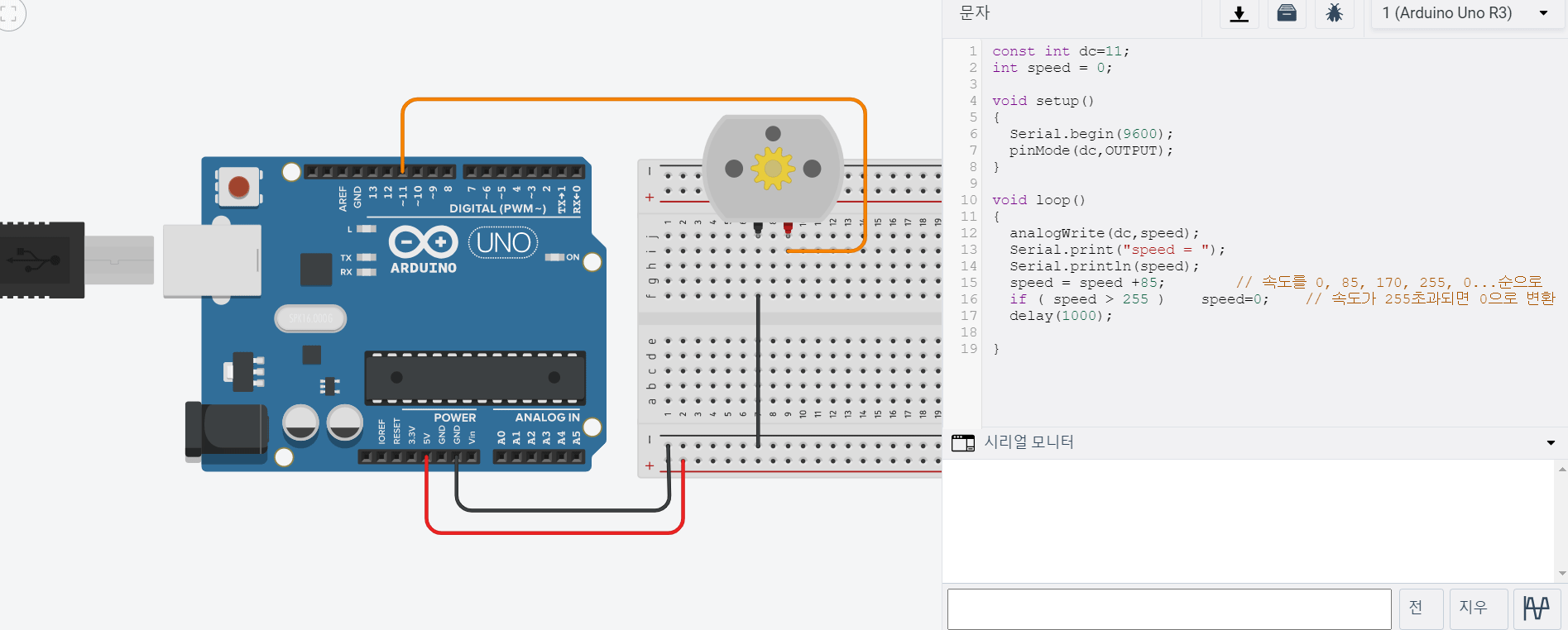 PWM제어가 가능한 디지털 11번핀을 이용해 아날로그 값을 입력해 DC모터를 구동시켰습니다. pwm은 0~255값을 가질 수 있고 0에 가까울수록 속도가 낮아지고 255에 가까울수록 속도가 빨라집니다.