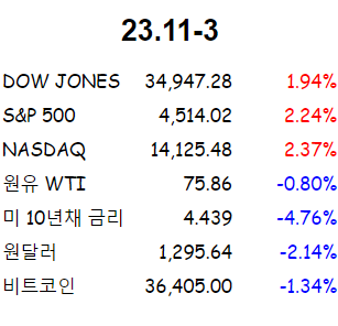 미 10월 cpi 및 근원 모두 예상치 하회. 3.2%. 이에 시장은 연준의 기준금리 인상 사이클 끝났다는 의견이 대다수.