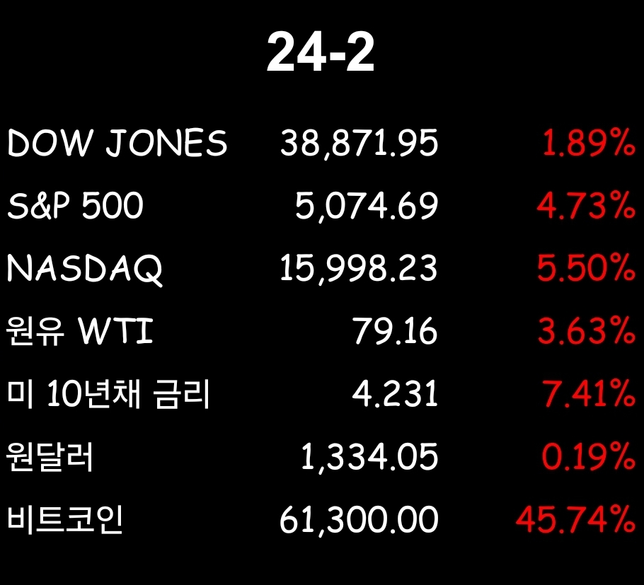 미국 연준 의장 파월이 3월엔 금리 못내린다고 못박는 발언. 이유로 인플레2%까지 떨어질지 확신하지 못하겠다는 발언.