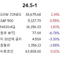 미국 기준금리 동결. 5.25~5.5유지. 금리인상 가능성 낮으며 이제 물가보단 고용에 더 집중하겠다는 입장. 미국 고용은 둔화되고 실업률도 높아지는 모습.