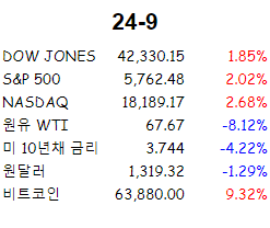 미국 연준 기준금리 0.5%내림 빅컷. 4.75~5.0%. 경제는 견조한 모습 보이는중. 미국 pce 2.2% 3년 6개월만에 최저 수치보이며 경제 탄탄한 모습. 경기침체 우려와 연착륙 기대에 조정과 상승 반복. 식품물가 급락 등 경기는 안좋은 모습을 보임. 미국 고용지표가 안좋게 나옴. 실업율과 인플레는 괜찮게 나오면서 옥신각신하는 모습.