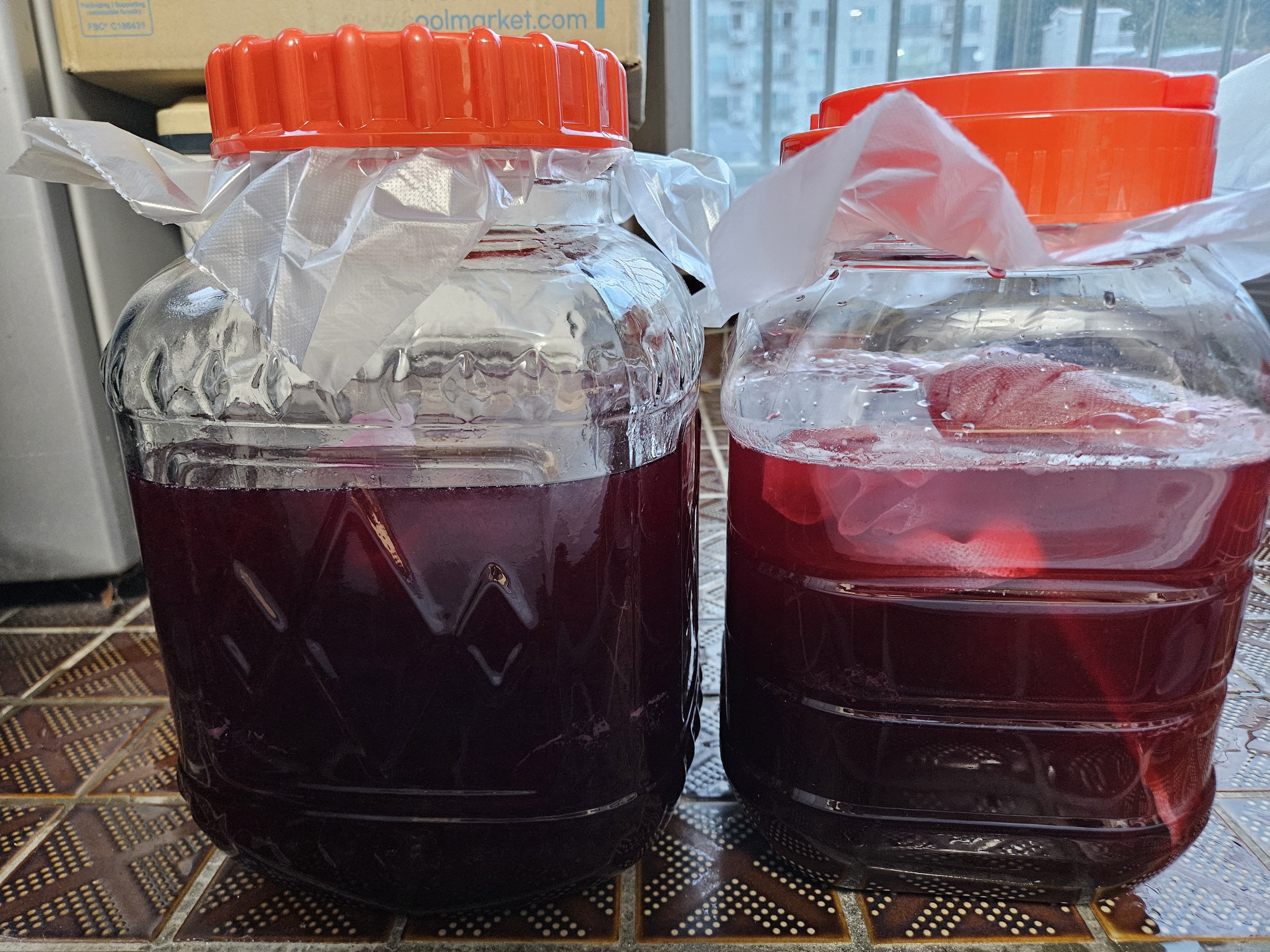 난 유리병과 페트 담그주통을 모두 사용했다. 유리가 더 좋을것같은 느낌?과 이유가 있겠지만 무겁고 비싸다는 단점이 있다. 모두 열탕소독을 진행했다.