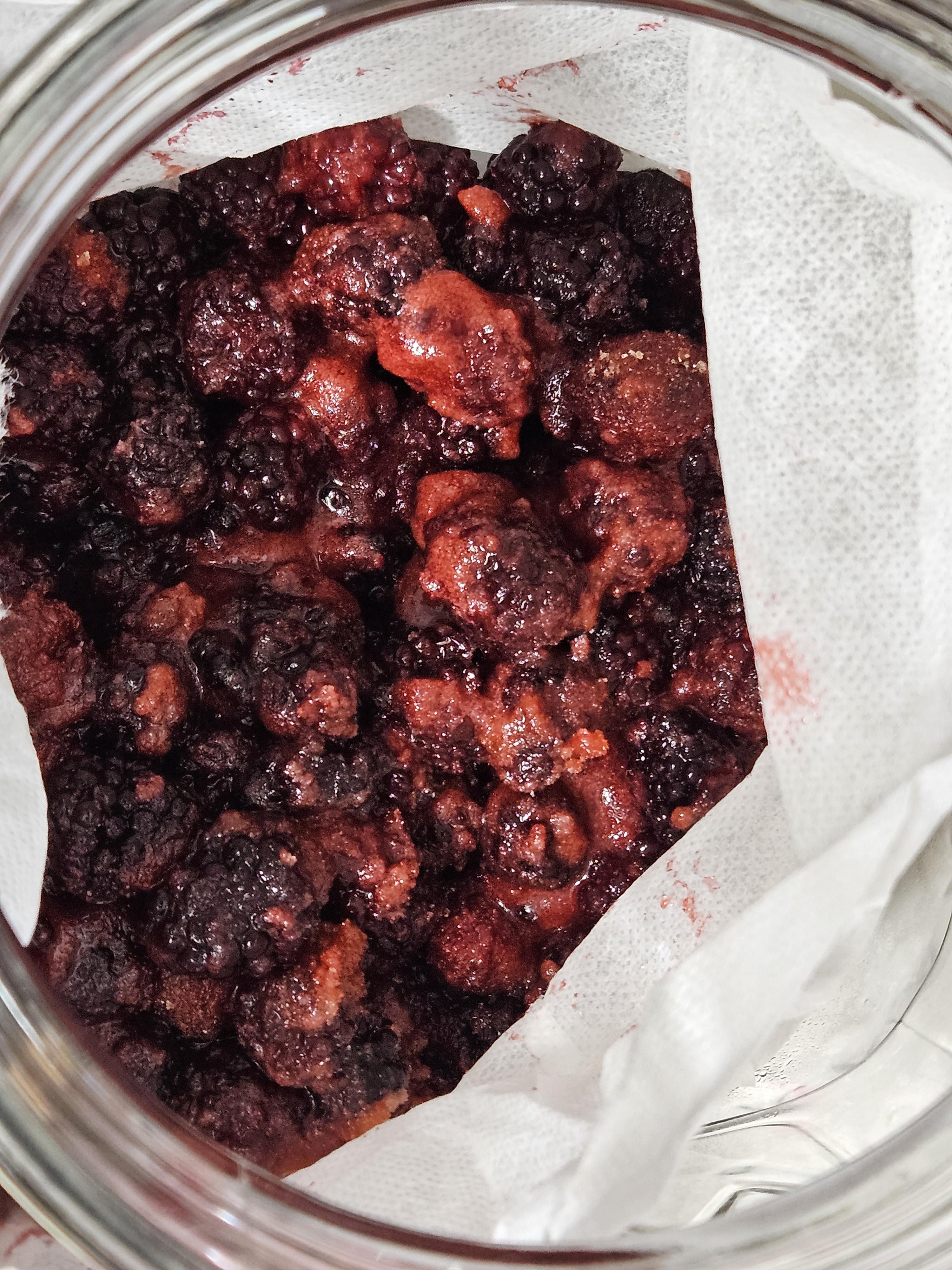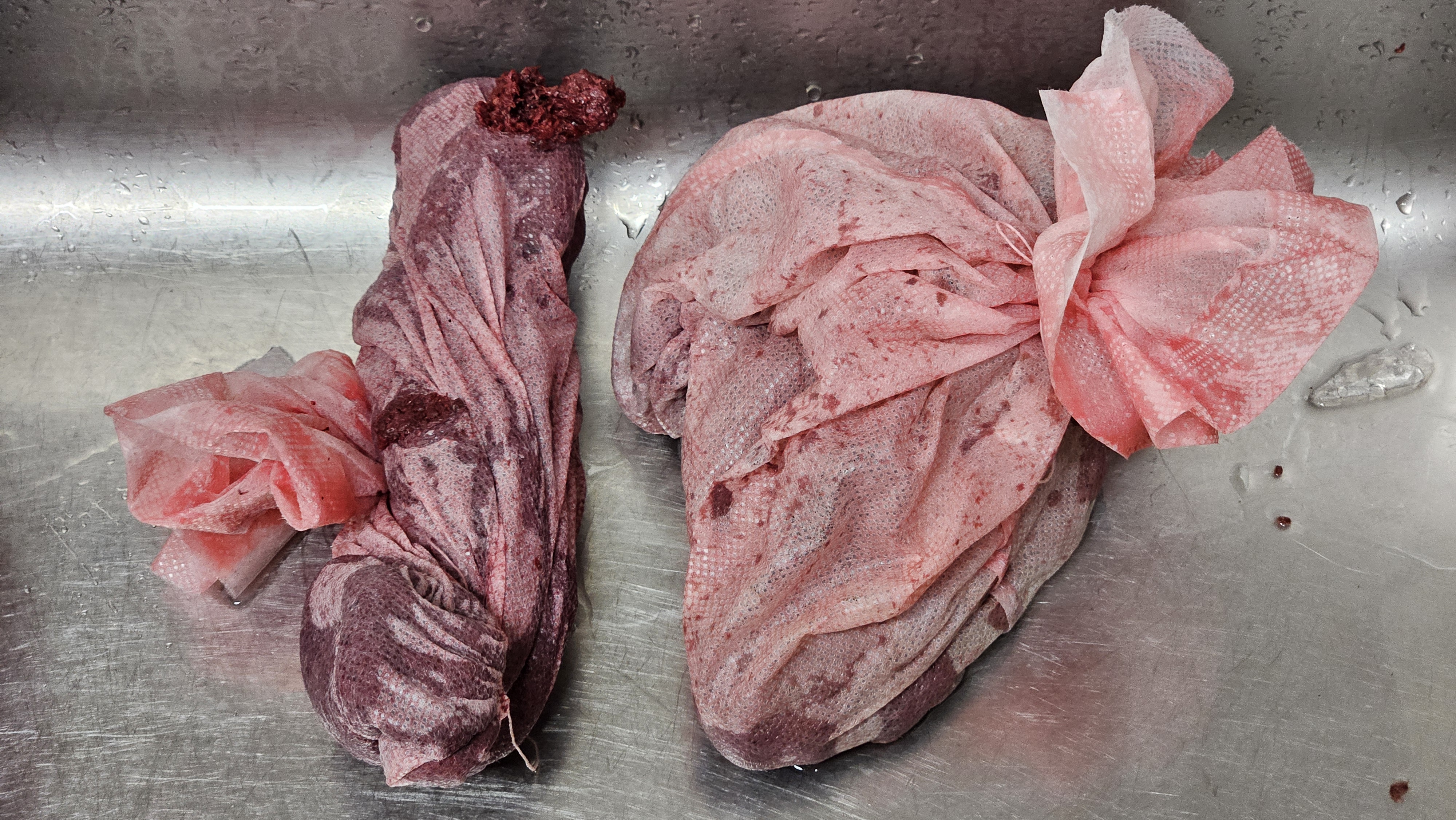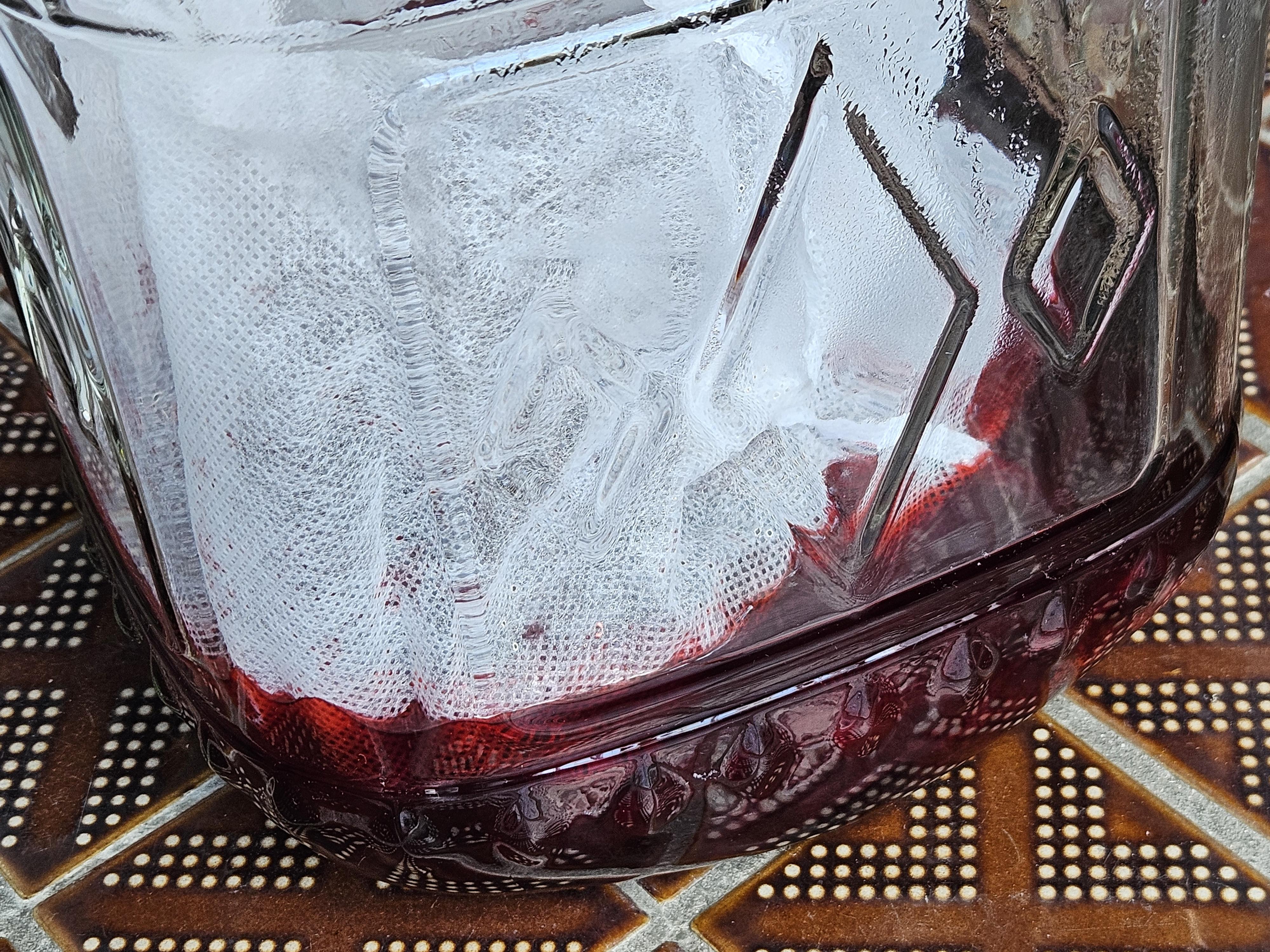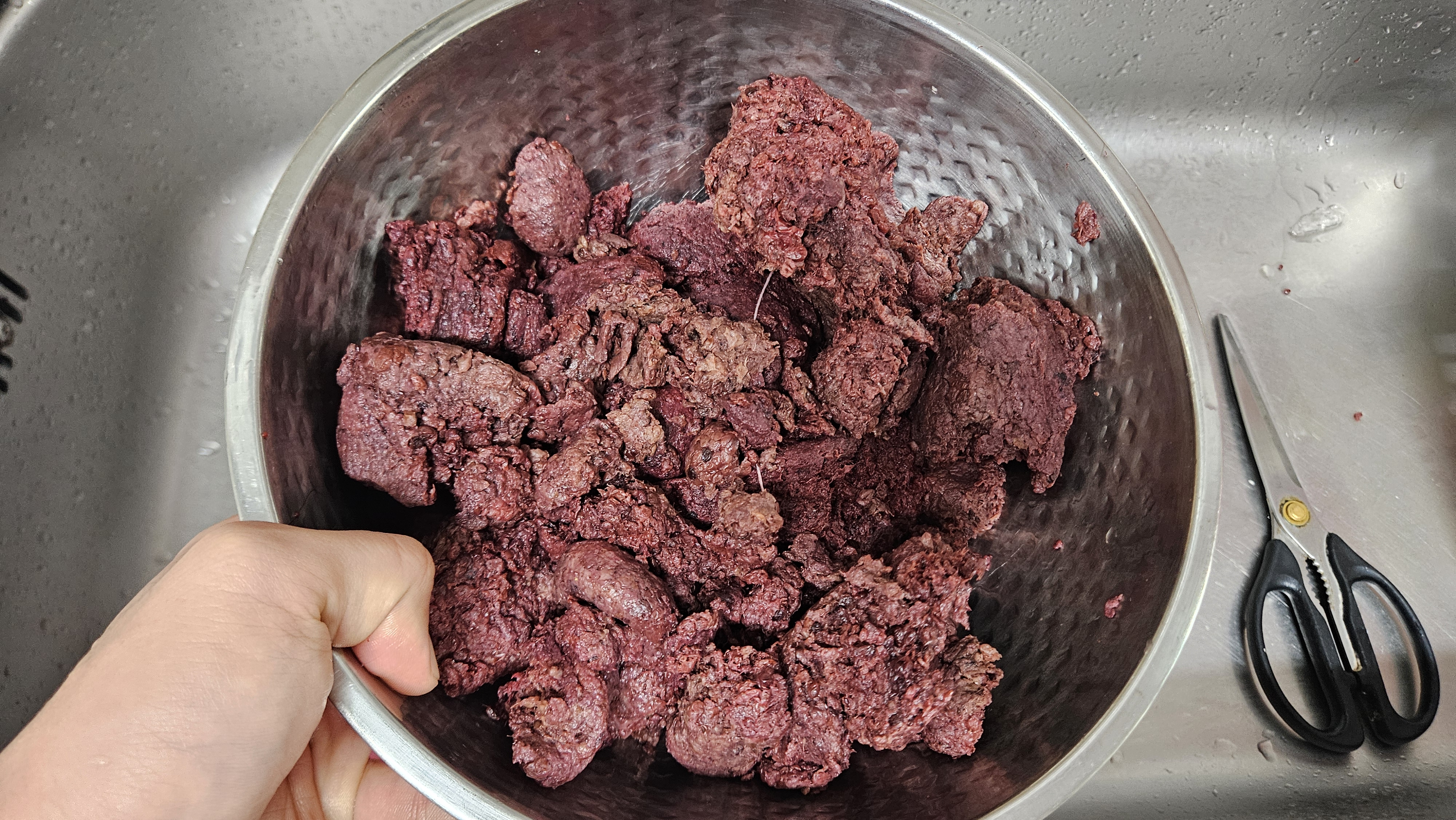 보자기 안에 복분자즙을 쭉 짜낸 모습이다. 짜도짜도 계속 즙이 나오는 느낌이었다. 이 작업을 하면서 어차피 이렇게 걸러내서 짜야하는데. 굳이 면보를 써야했나? 라는 생각도 했다. 지금 계속 생각해보니 그래도 면보에 넣어서 하는게 더 깔끔하고 편할 것 같다. 생각보다 면보안에 즙이 매우 많이 응축되어있었다. 손으로 짜는 것보다 볼위에 뜰채를두고 눌러서 짜는게 편할 것 같다.