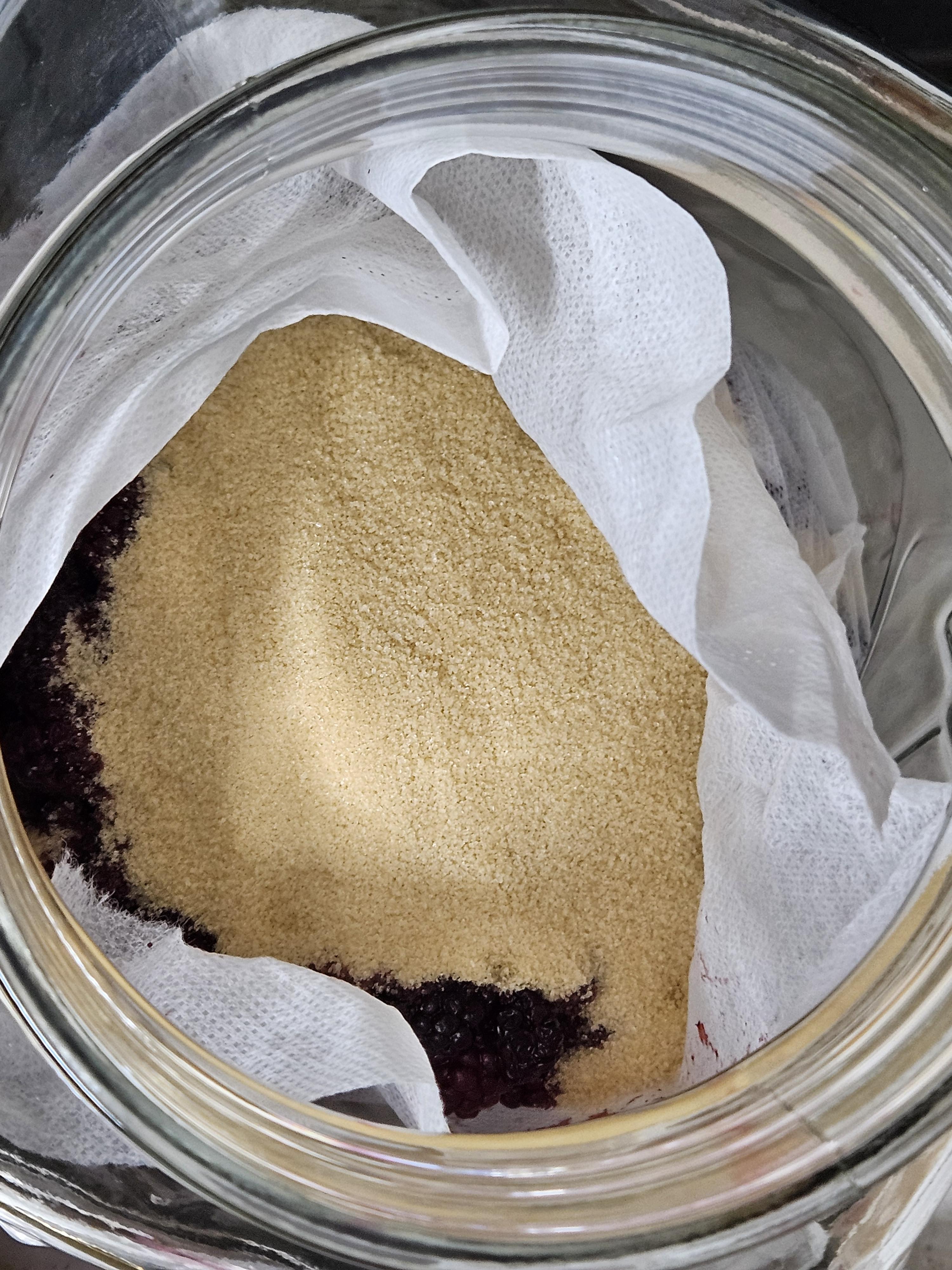 복분자주는 나중에 복분자를 다시 걸러서 꺼내야한다. 그래서 애초에 면보같은곳에 넣어서 진행하면 나중에 손쉽게 복분자만 거를 수 있다. 그런데.... 면보에 복분자를 넣고 통에 넣으려니 입구가 작아 안들어갔다😭 그래서 면보를 미리 통에 넣고, 컵에 복분자를 떠서 통 안으로 넣었다. 다음에는 면보 사이즈를 통 입구와 마춰서 구해야 할 것 같다.