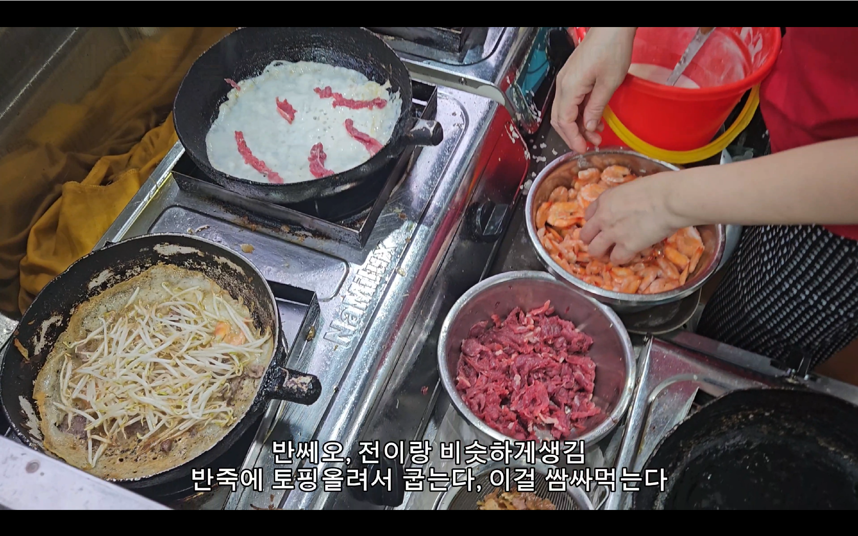 반쎄오는 반죽위에 야채랑 고기 새우 등등을 넣고 구운 여리를 라이스페이퍼와 야채와 함께 싸먹는 베트남 요리다.