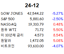 미국 연준이 12월 기준금리를 0.25bp 내림. 그러나 강한 경제상황과 더디게 하락하는 물가를 이유로 25년 금리인하 횟수를 4회서에서 2회로 축소하며 매파적인 모습 보임. 미국 연 경제 성장률은 3.1%상승으로 강한 모습 보임. 11월 cpi 2.7% 상승으로 예상치 부합.