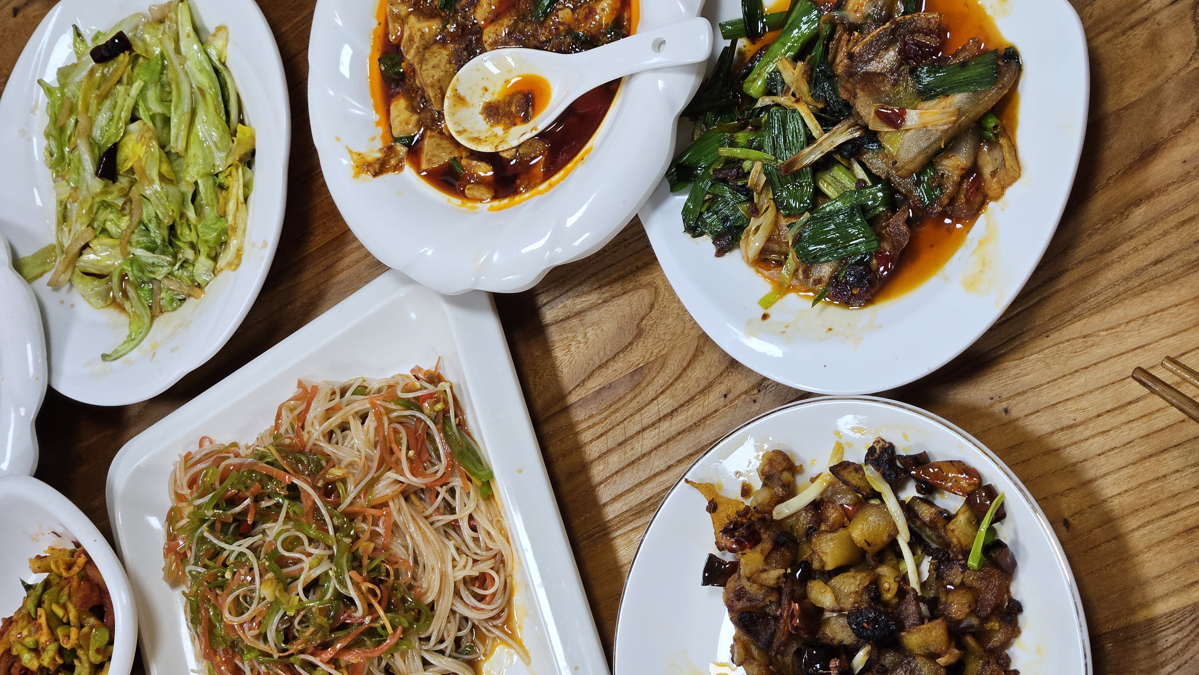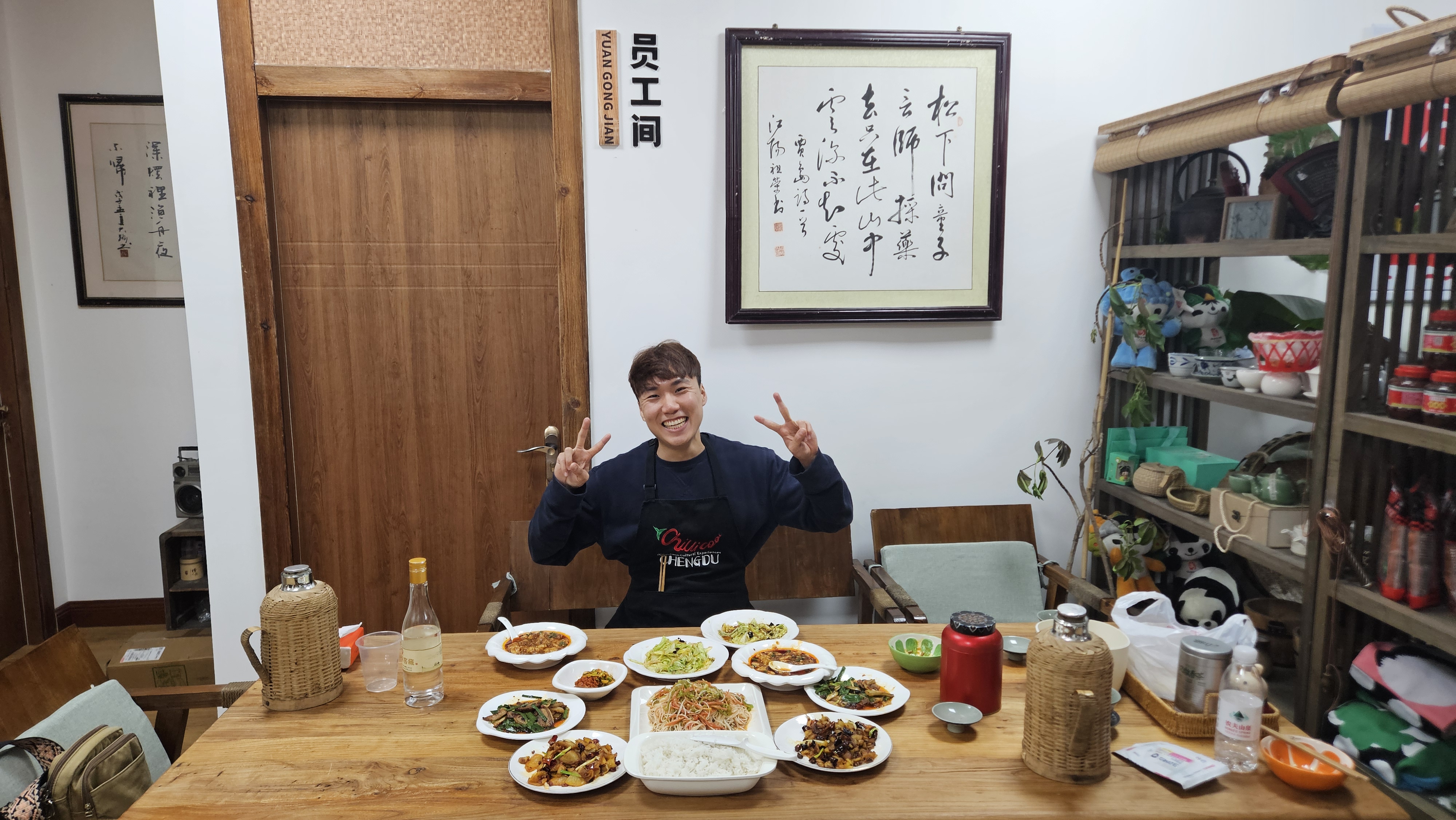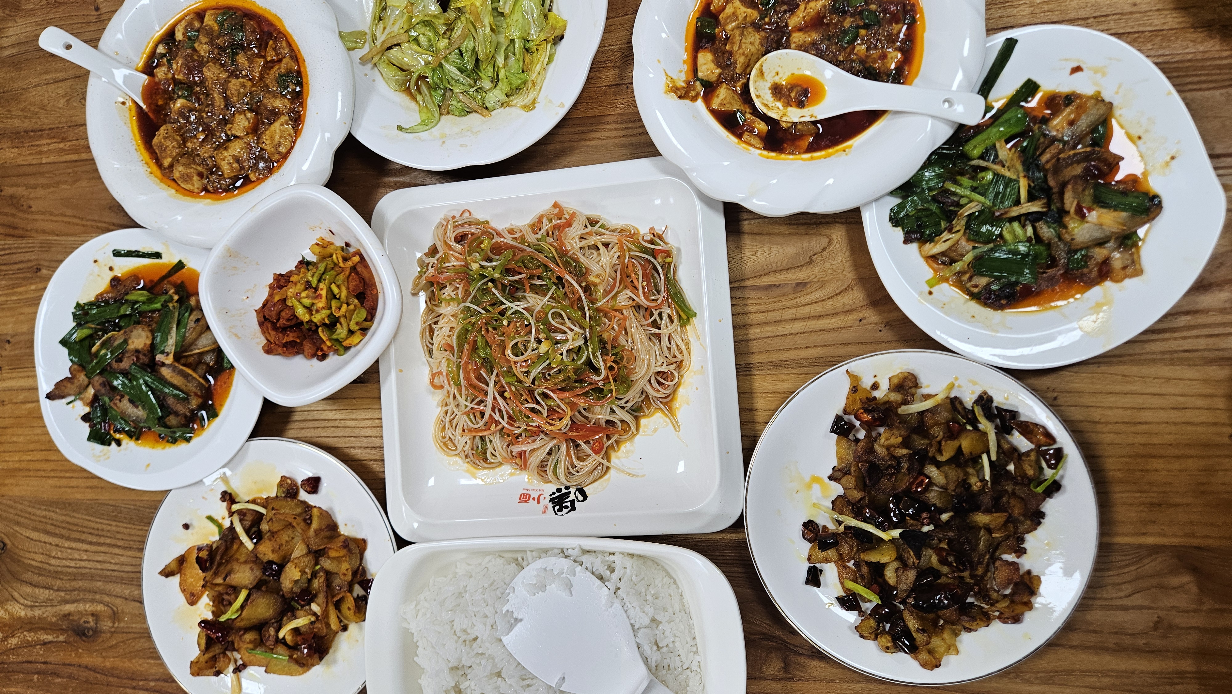 이렇게 5가지 요리가 모두 완성되면 테이블로 옮겨서 밥이랑 같이 식사한다. 가이드 행님이 있어서 3명이긴 했지만 양이 너무나도 많았다. 이곳에 간다면 식사를 먹지말고 가길 추천한다. 맛은 다 괜찮았다. 개인적으로 배추볶음이 너무 아삭하고 감칠맛도 넘치게 맛있었다. 오겹살 마라 볶음을 우리 모두가 아는 그 맛에 두반장 소스를 곁들인 요리, 마파두부는 매콤짭짤 마파두부 맛이었고, 감자랑 샐러드는 맛 없지는 않았지만 쏘쏘했다.