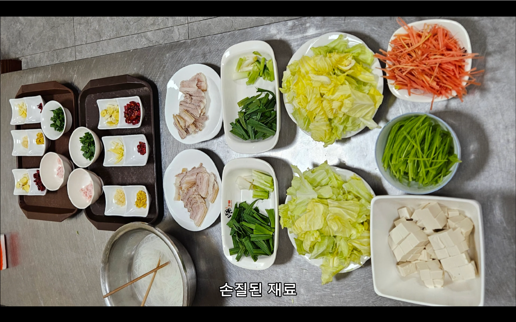 처음 주방기구 사용법과 각종 조미료, 소스, 재료를 보며 설명을 듣는다. 비슷해보이지만 다르고 간장이라도 한국에서 내가 먹던것과는 맛이 달랐다. 만드는 방법이 다른 모양이다. 앞치마를 매고 손을 씻은 후 재료 손질을 시작한다. 손질한 재룐ㄴ 각종 야채와 두부 돼지고기다. 오랜만에 칼질이었는데 중식칼? 같이 큰 칼을 처음 만져봤다. 무겁고 잘 썰리는 기분이었다.
