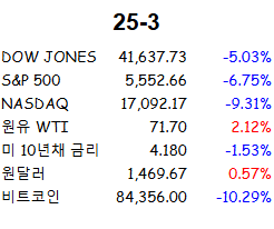 미국 주식은 계속 하락방향으로 향하고 유럽 아시아 등 몇 나라들은 상승하는 모습 보여주는 중. 트럼프 행정부의 행동으로 관세 인플레이션 등이 원인으로 오르고 있지만...? 이미 다 언급된 내용들로 조정받는 모습이라 생각함.