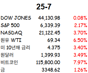 미국 6월 cpi는 예상치 부합하는 전년대비 2.7%상승. 미국 트럼프가 대부분 국가에 유럽, 일본, 한국 등 국가에 10~15%관세와 농산물, 자원, 투자 유치 조건으로 협상을 완료하는 모습. 중국에는 90일 관세 연장하며 지켜보는 중.