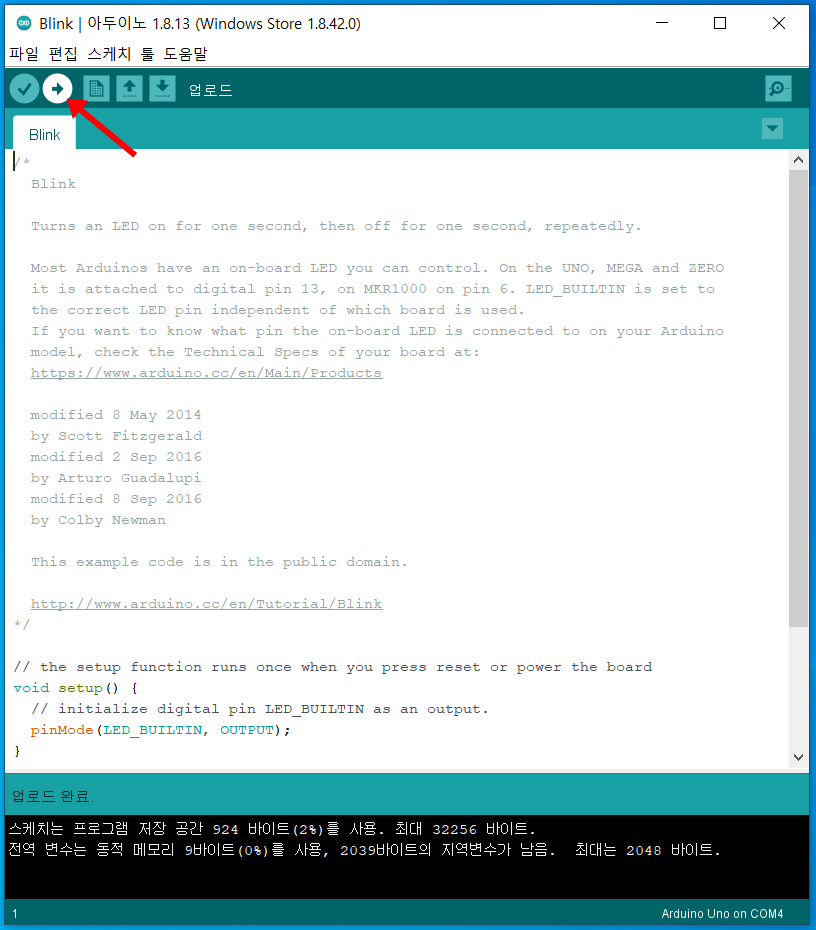 화살표가 가르키는 업로드를 눌러 코드를 아두이노에 전송합니다.