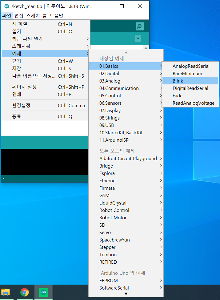 파일 - 예제 - 01.Basics - Blink 를 선택합니다.