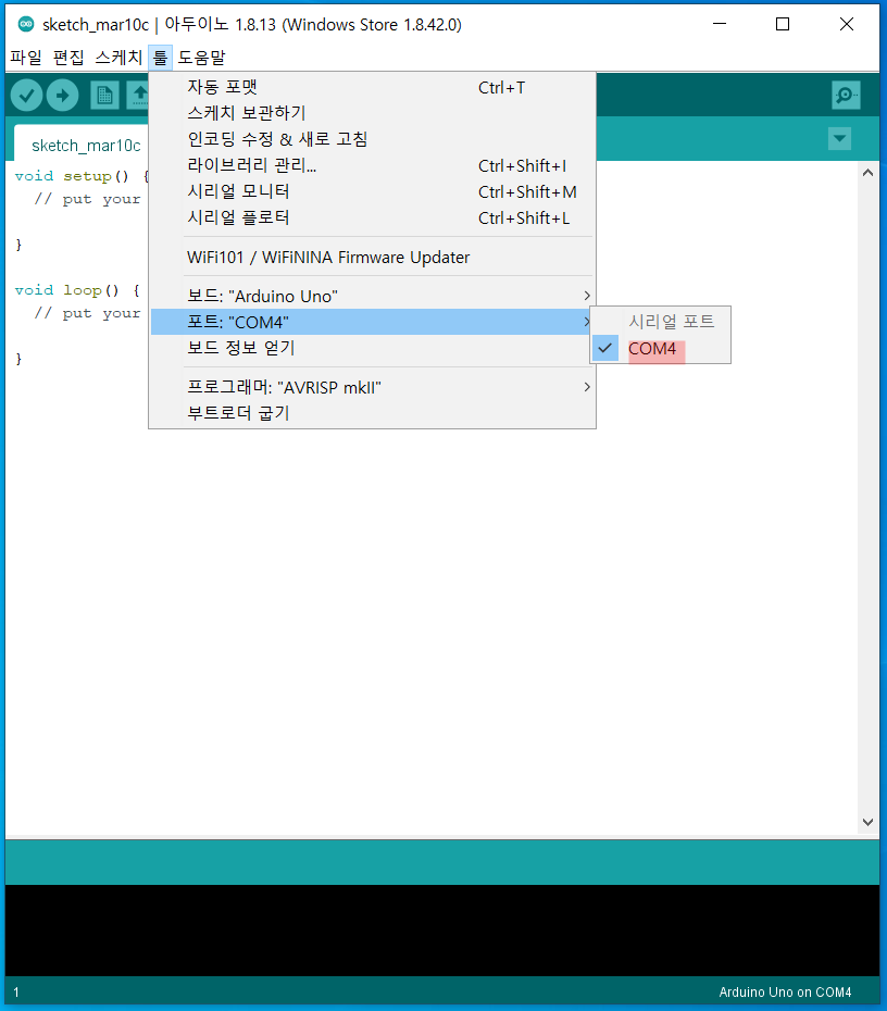 포트 숫자는 환경에따라 다르기 때문에 COM4가 아닌 다른 포트가 있다면 그 포트를 연결하면 됩니다.
