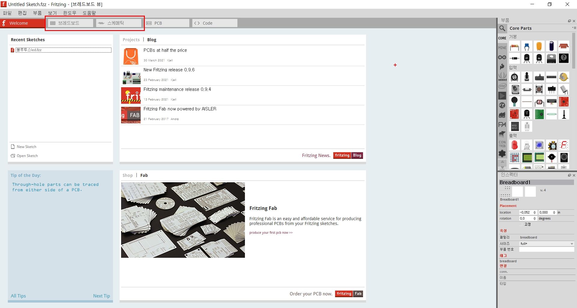 하지만 띵커캐드 사용중에 가장 불편하게 느꼈던 부분은 내가 사용하고 싶은 부품이 없는 경우가 많다는 것이었습니다. 기본적인 저항, 다이오드, 센서는 사용할 수 있지만 통상적으로 많이 사용하지 않는 지문인식센서, 블루투스 센서 등을 포함한 회로는 띵커캐드에서 구현할 수 없습니다.