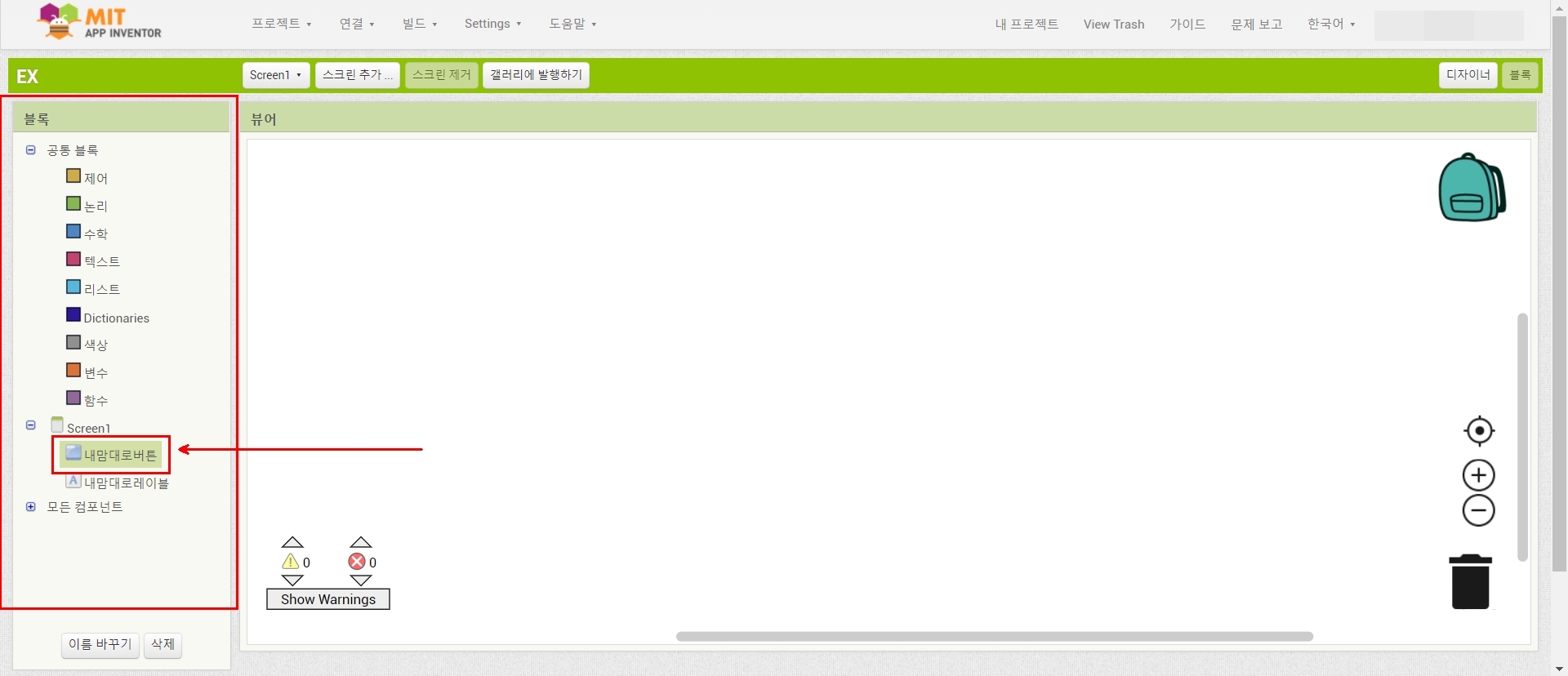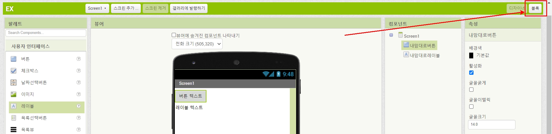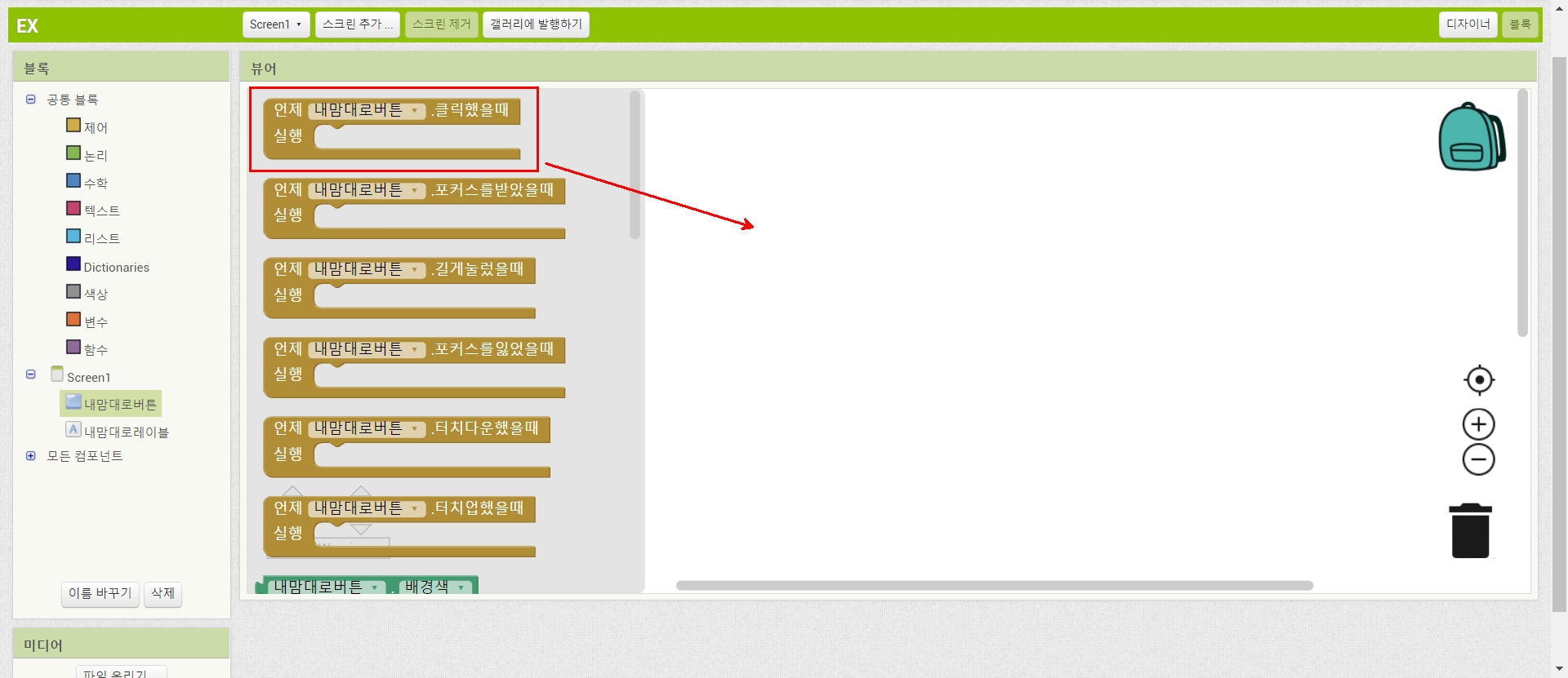 그러면 블록 생단 환경으로 넘어옵니다. 버튼을 컨트롤하기위해서는 좌측의 '블록' 목록에서 제가 지정한 버튼 이름인 '내맘대로버튼'을 클릭합니다.