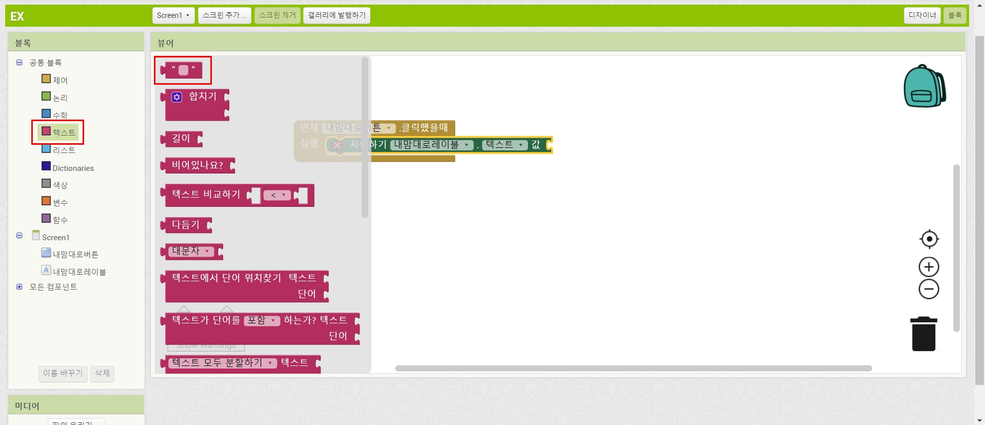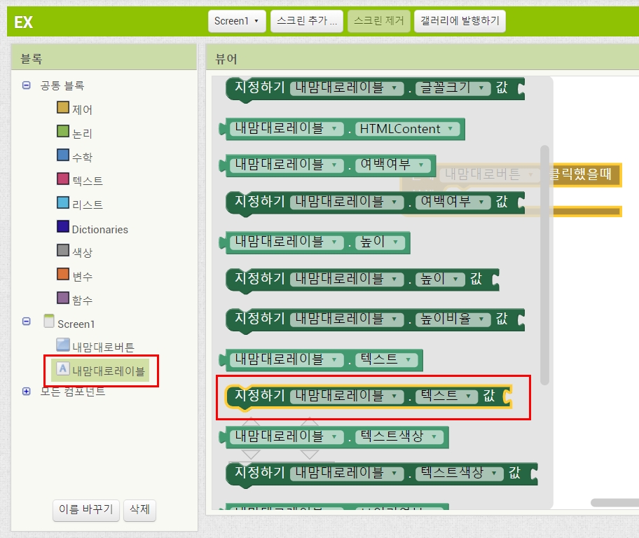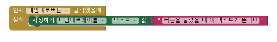 버튼 조작으로 레이블의 텍스트 값을 변경시키기 위해 위의 '지정하기 내맘대로레이블 텍스트 값' 블록을 가져옵니다.