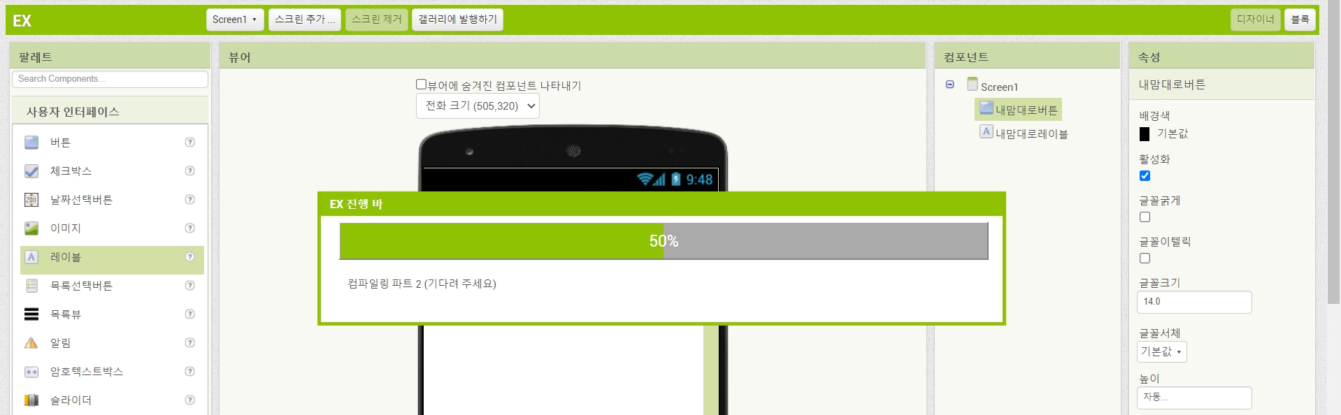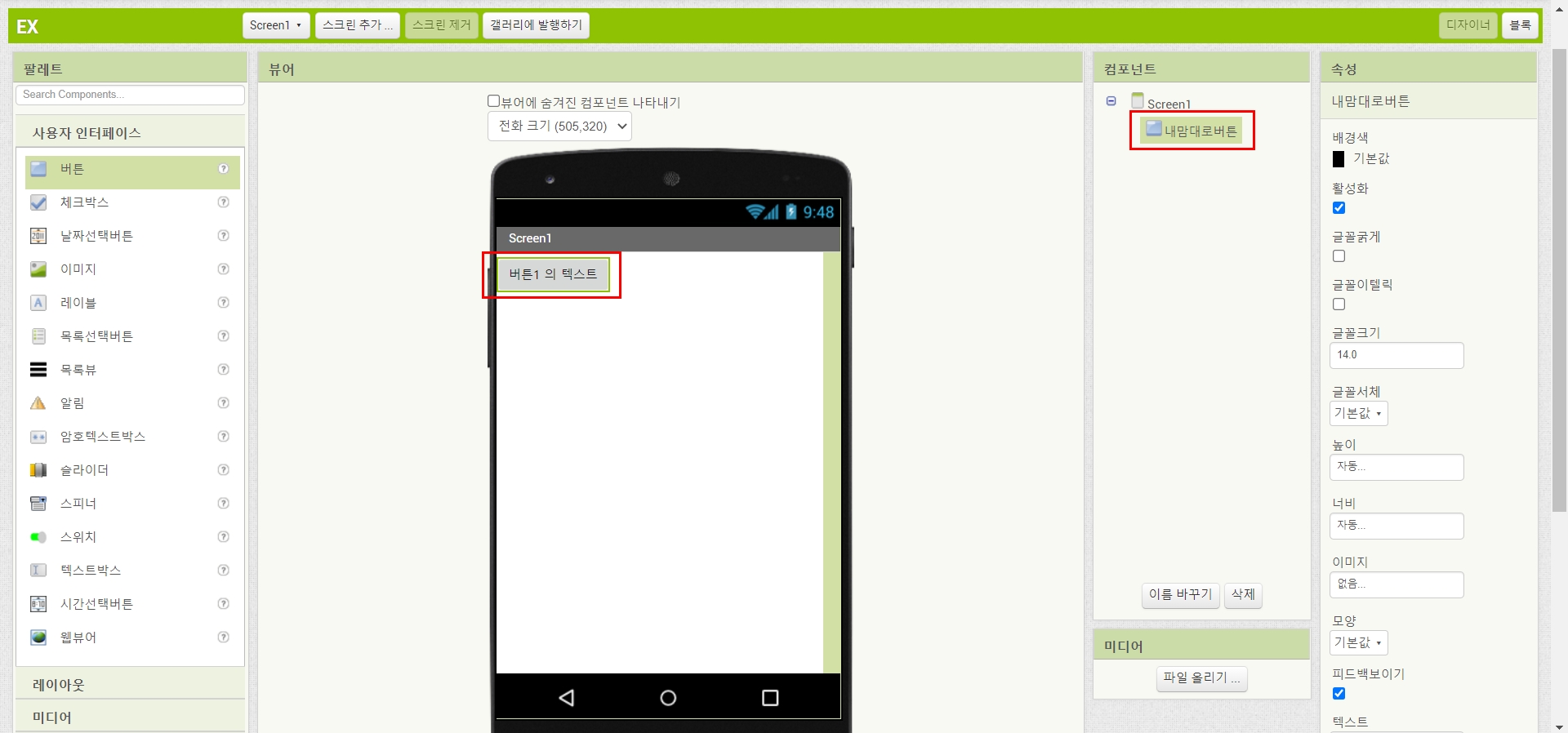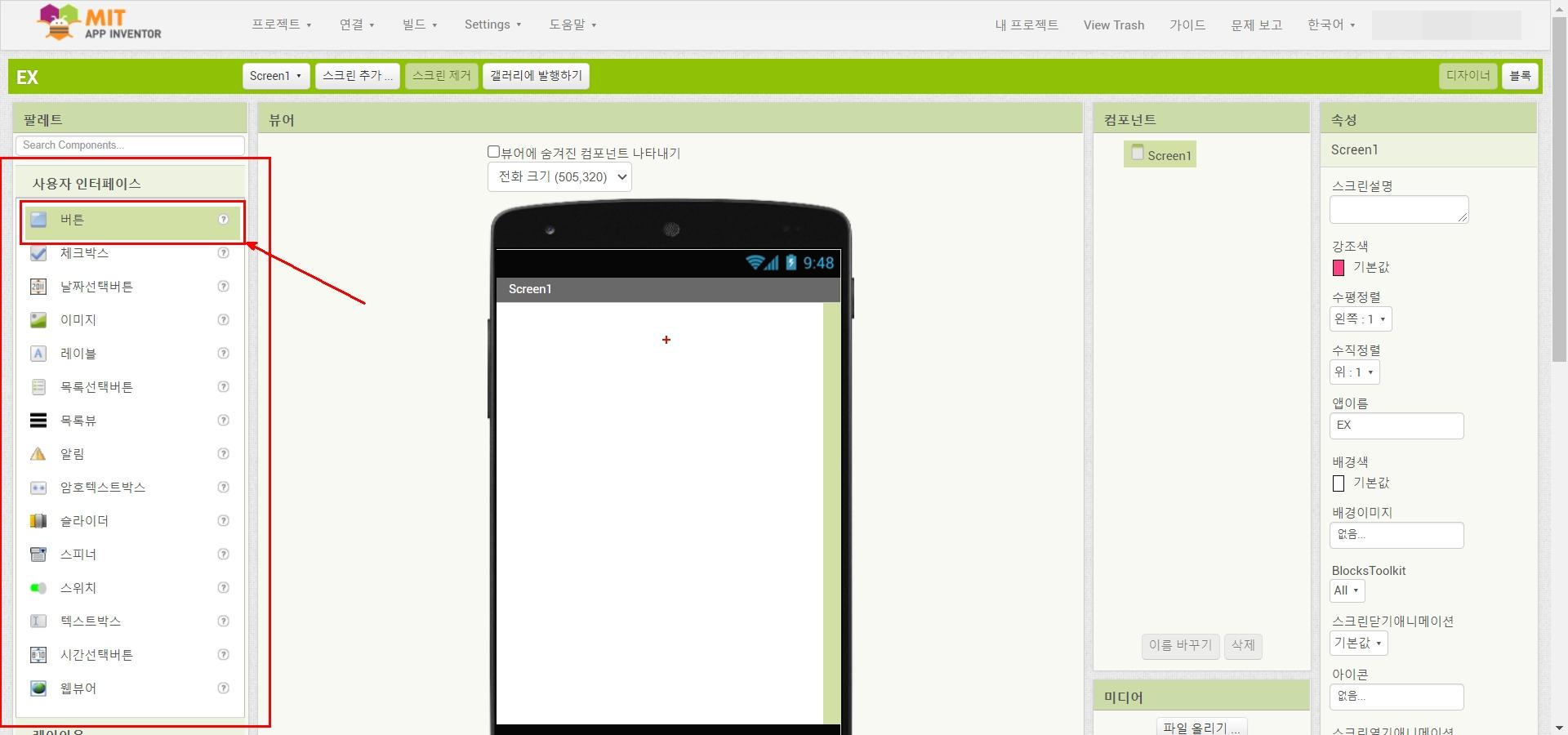 저는 프로젝트 이름을 'EX'로 정하였습니다. 확인을 누르면 프로젝트 화면으로 넘어오게 됩니다. 우선 가장 기본적인 버튼을 생성해보겠습니다. 왼쪽의 '사용자 인터페이스' 목록의 '버튼'을 스마트폰 화면 위로 드래그합니다.