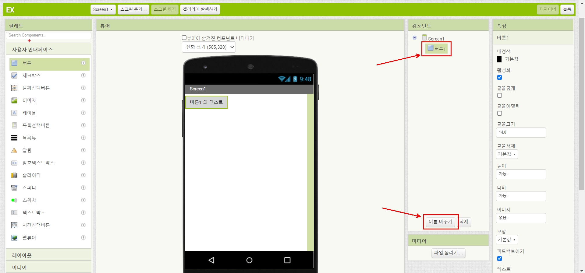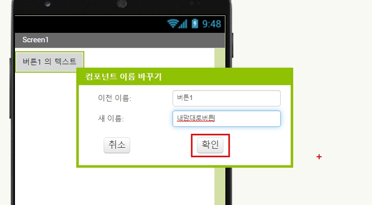 그림과 같이 버튼이 생성되었습니다. 우선 버튼의 이름을 변경해보겠습니다. 우측의 '컴포넌트'에서 '버튼1'을 클릭하고 하단의 '이름 바꾸기'를 클릭합니다.