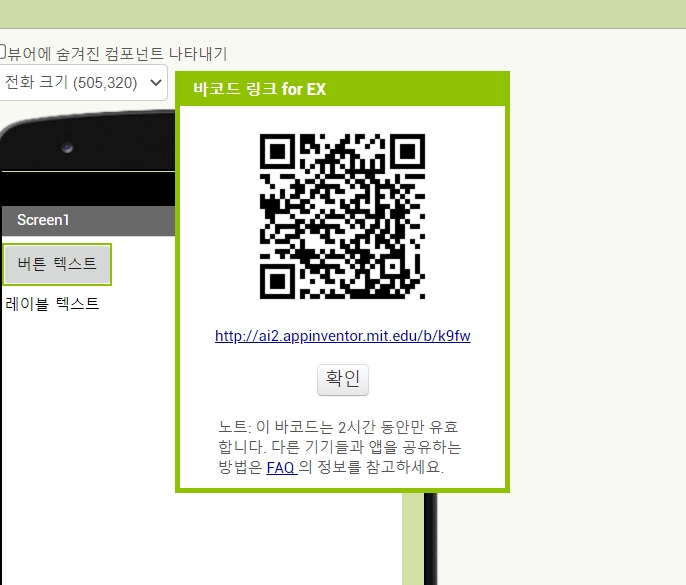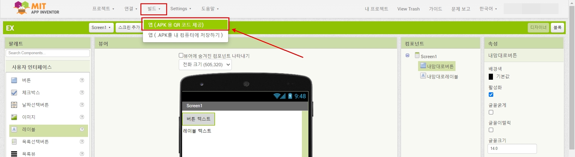 다시 디자이너 생성 환경으로 돌아와서 상단의 '빌드'에서 '앱(APK용 QR 코드 제공)'을 클릭합니다. APK파일을 다운받아서 폰으로 옮겨도 되지만 QR코드를 사용하면 더 편리하게 사용할 수 있습니다.