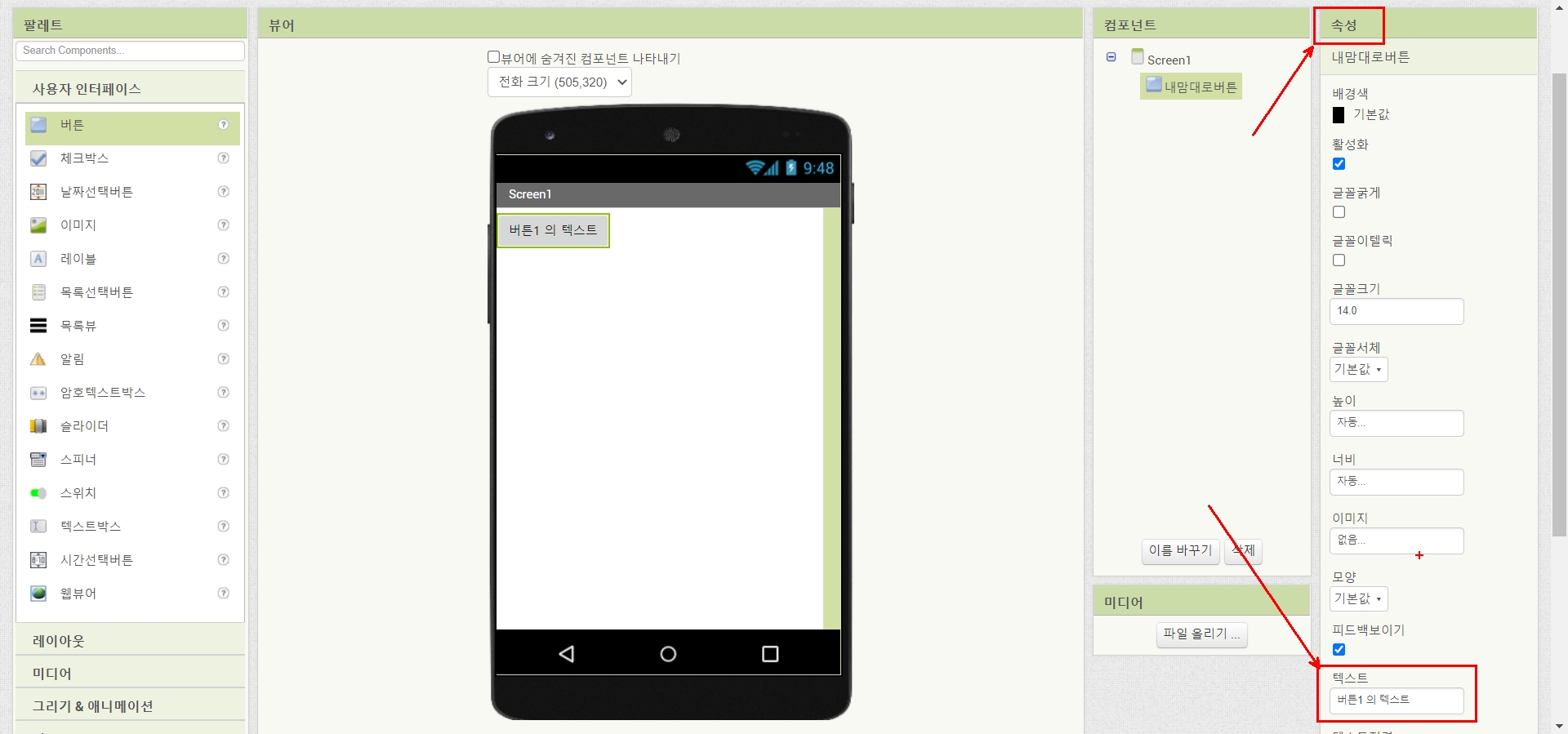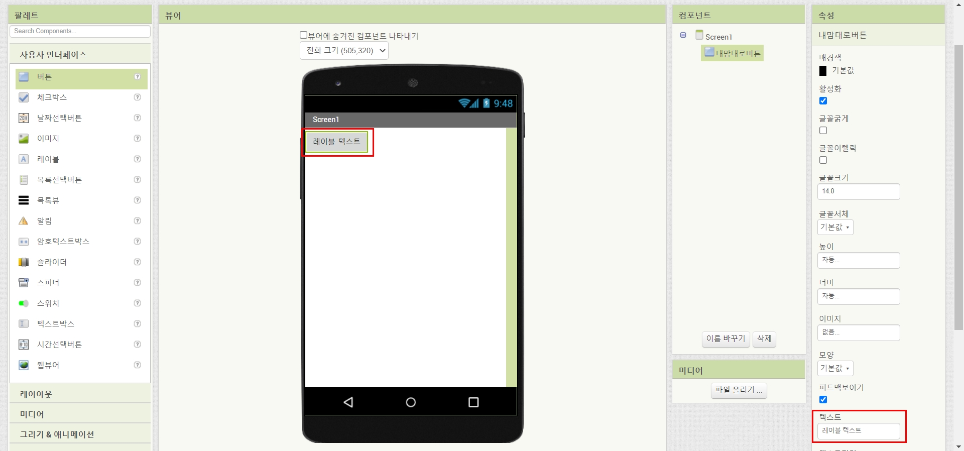 우측의 '속성'에서 '텍스트'를 변경합니다.