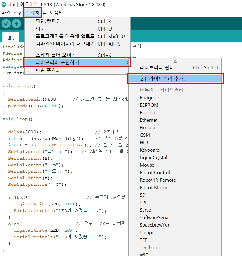 안녕하세요. 공대 박형입니다. 오늘은 아두이노에서 온습도 센서를 사용하는 방법을 알아보고, 온습도 센서를 통해 LED를 제어 해보겠습니다. 우선 아두이노에서 DHT온습도센서(11버전, 22버전 모두)를 사용하기 위해서는 온습도센서 관련 정보가 담겨있는 라이브러리를 추가해야 합니다. 라이브러리란 자주 사용하는 변수, 함수 등을 따로 한 파일에 미리 지정하여 저장하고, 그 지정한 파일을 불러옴으로써 내가 작성하는 코드에서 변수나 함수를 정의하지 않아도 불러온 파일에 있는 함수, 변수를 사용할 수 있는 기능이 있습니다. 사용하기 복잡하거나 까다로운 센서 같은 경우는 제조사에서 센서를 사용하기 쉬운 환경을 제공하기위해 라이브러리를 추가로 제공하는 경우가 많습니다. DHT센서도 이러한 경우라고 할 수 있습니다. 라이브러리를 추가하는 방법은 다양하지만 저는 기존에 가지고있던 라이브러리 zip 파일이 있어 zip 파일을 추가하는 방식으로 라이브러리를 추가했습니다. 저와 같은 방법으로 라이브러리를 추가하실분들은 아래 파일을 다운로드하시면 됩니다.
