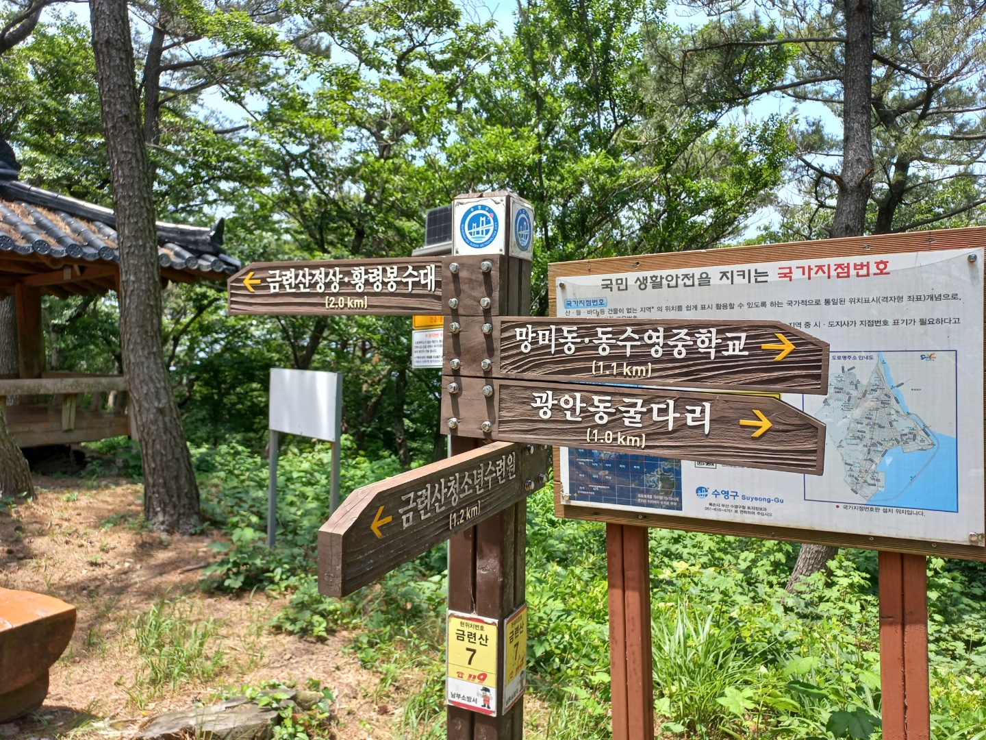 금련산 정상의 고도는 413.6m입니다. 옛날에는 비석이 있었는데 언제부턴가 비석은 없고 나무에 팻말만 붙어있네요. 금련산은 중간중간에 쉼터가 정말 많아요. 운동하시는 분들도 많고 강아지와 함께 등산하시는 분들도 많이 발견할 정도로 편하게 등산할 수 있는 길입니다.