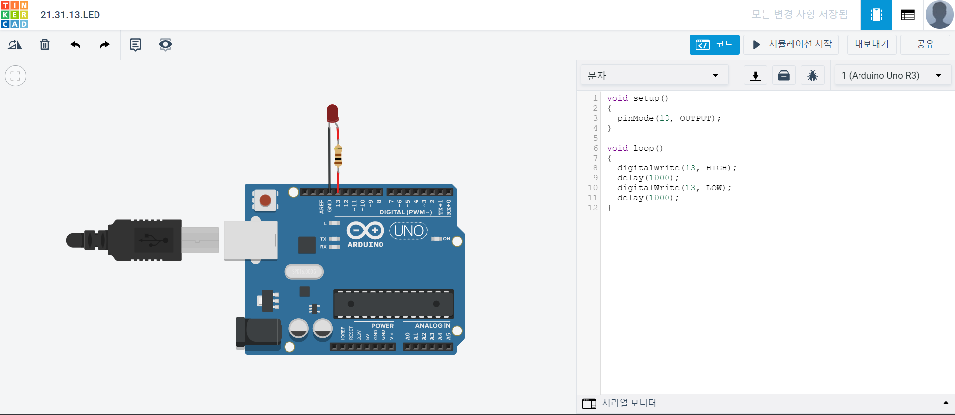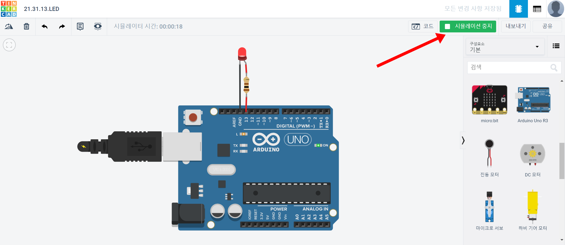 코딩을 완료했다면 시물레이션 시작을 눌러 실제 보드를 동작시켜볼 수 있습니다.