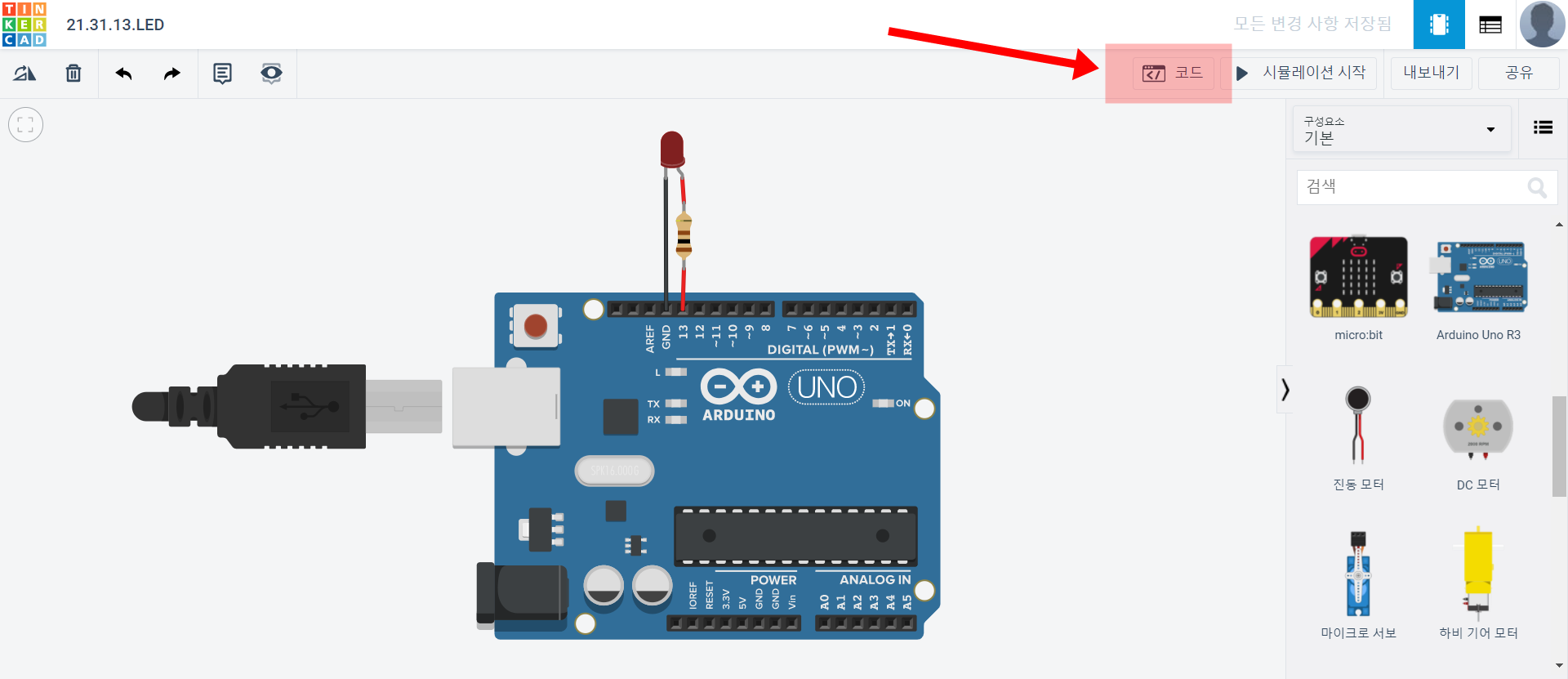 회로를 구성했다면 코드를 눌러 아두이노 코딩을 할 수 있습니다.